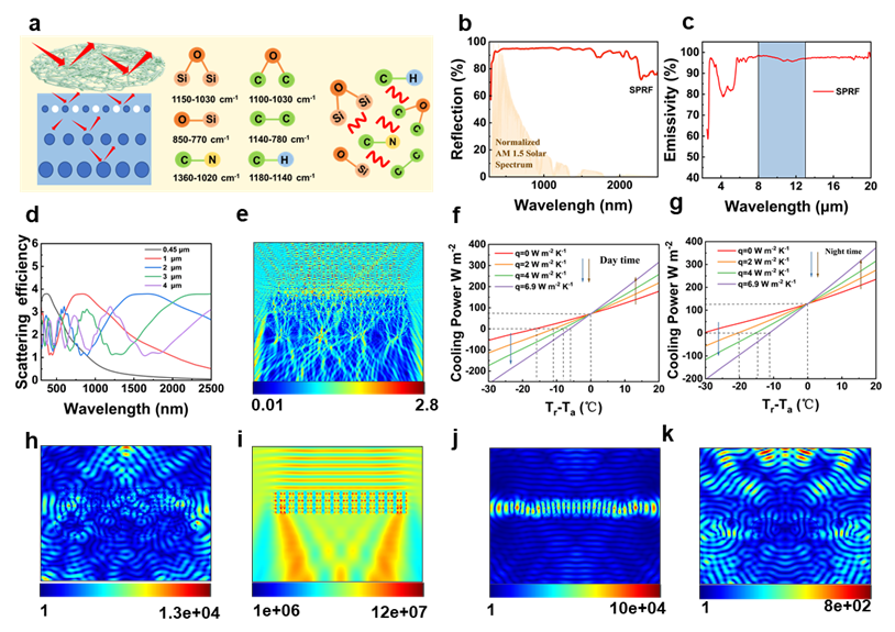 如图2所示,所制备的多级梯度结构的静电纺丝织物,通过调控纤维直径,实现了太阳光谱内的宽反射,反射率为94.2%。无机纳米颗粒与有机聚合物耦合使其在中红外波段达到了96.9%的发射率。