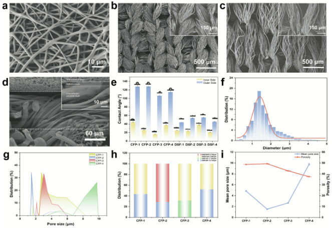 图2:织物的微观形态、润湿特性和孔径特征。