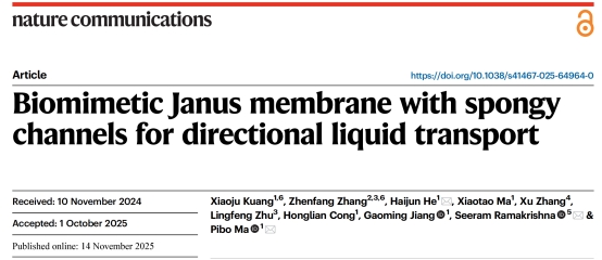 /针织技术教育部工程研究中心蒋高明教授团队在综合性国际期刊《Nature Communications》上发表题为“Biomimetic Janus Membrane with Spongy Channels for Directional Liquid Transport”的期刊论文。实现了抖阴