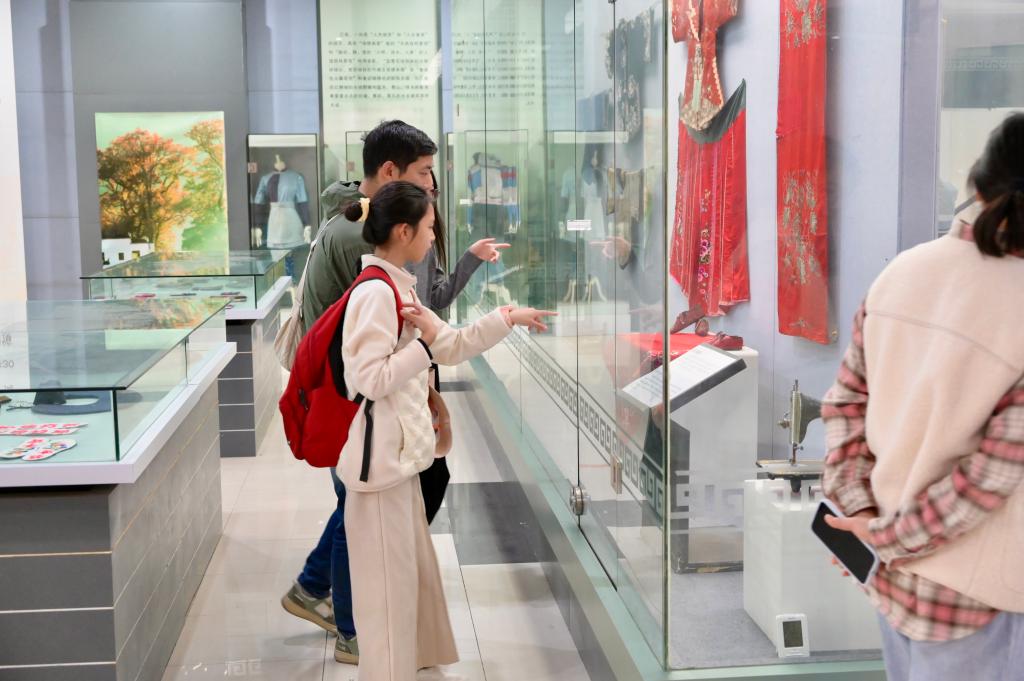 在志愿者引导下,孩子和家长们有序走进民间服饰传习馆,近距离感受中华纺织文化的深厚底蕴。馆内陈列的传统织物、特色服饰、纺织原料与机具,无不吸引着孩子们驻足观看、认真聆听。志愿者们用通俗易懂的语言,为大家讲解棉、麻、丝、毛等天然纤维的特点,介绍传统纺织技艺的发展历程,讲述一件件精美展品背后的故事。孩子们认真观察、积极提问,在沉浸式体验中了解 “衣被天下” 的纺织文明,感受一针一线所承载的匠心智慧。